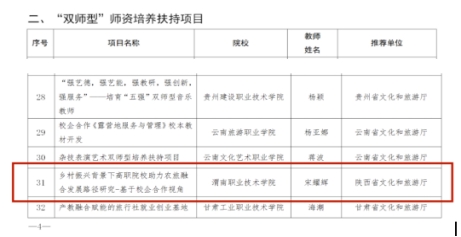 近日,文化和旅游部公布了《2022年度文化艺术职业教育和旅游职业教育提质培优行动计划项目入选名单》,我校经济管理学院宋耀辉博士的《乡村振兴背景下高职院校助力农旅融合发展路径研究——基于校企合作视角》课题成功入选“双师型”师资培养扶持项目,是全国39个入选项目之一,陕西省职业类院校唯...